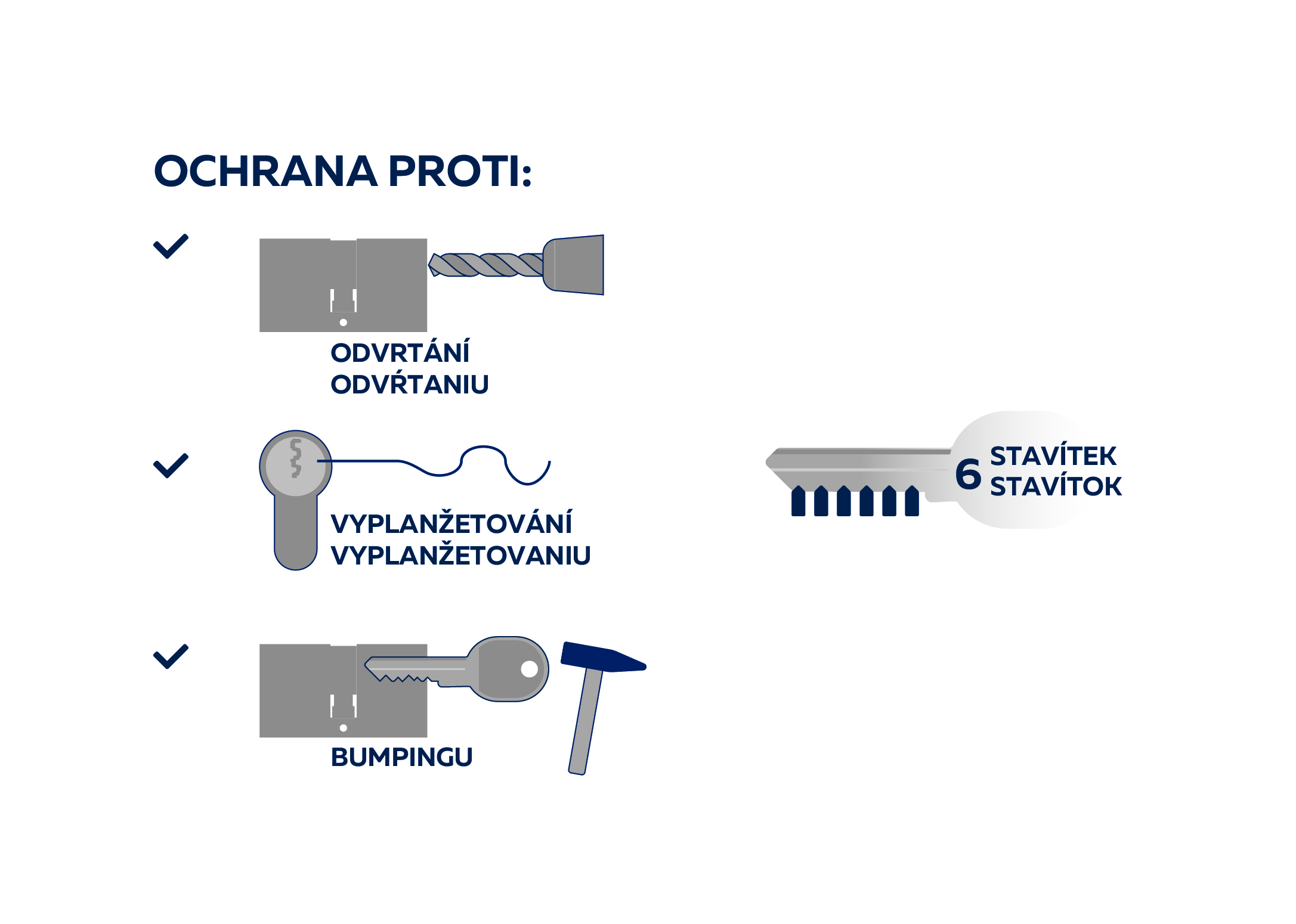 • Osazená 6stavítková bezpečnostní vložka nabízí zvýšenou ochranu proti odvrtání, bumpingu i vyplanžetování (nově vyvinutý, bezpečnější profil).