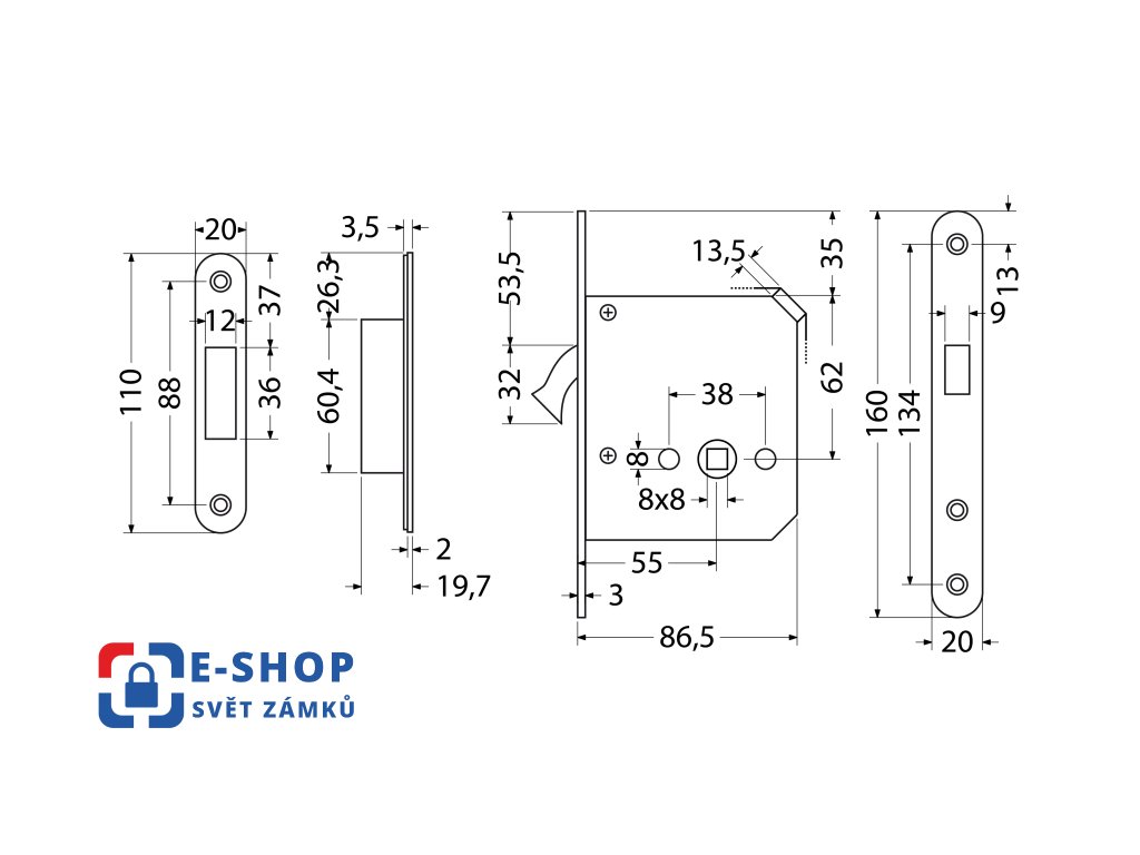 Zadlabací hákový zámek pro posuvné dveře a WC kličku EN.304.HKM.WC.55.20