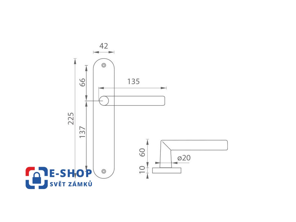 Štítová klika na interiérové ​​dveře s oválným štítem je vyrobena z vysoce kvalitní nerezavějící oceli, známé jako nerez a je povrchově upravena. Oválný štít má rozměry 42 mm x 225 mm.