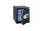 Ocelová pokladnička s páčkou pro pohodlné otevření víka a blokací proti jeho samovolnému zavření