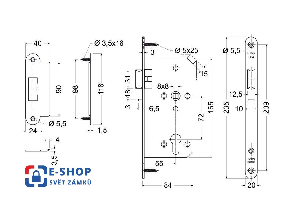 Zadlabací střelkový zámek s blokací střelky, pro kování koule/klika. RICHTER EN.304.BS.72.55.20.PL